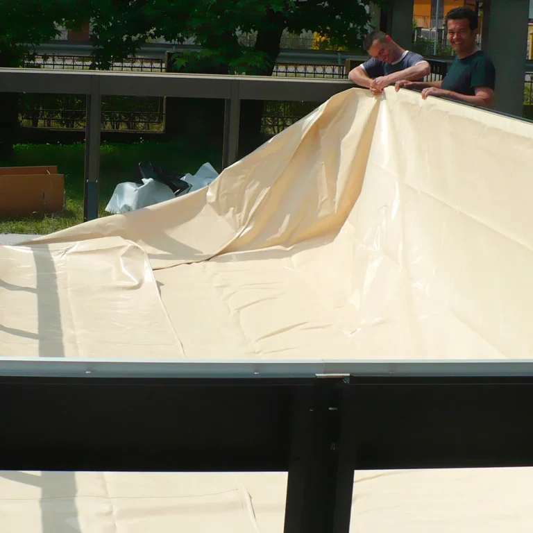 La toile, membrane tensostructurelle hautement résistante à la traction, est ensuite traitée anti-UV avec l’utilisation d’additifs spéciaux qui limitent de manière exponentielle la détérioration du matériau.