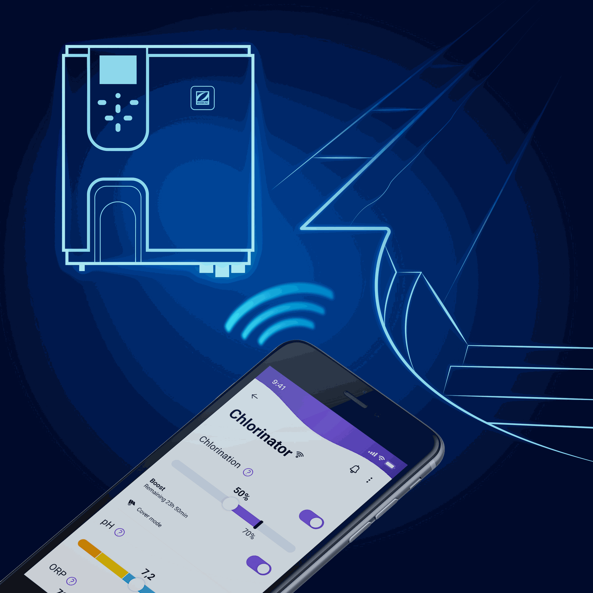 Grâce à la connexion Wi-Fi intégrée, vous pouvez configurer facilement et depuis n'importe où toutes les fonctionnalités de votre piscine via l'application Fluidra Pool®. Il s'agit d'une application simple et intelligente qui permet de visualiser et de gérer à distance les paramètres de tous les équipements de la piscine.